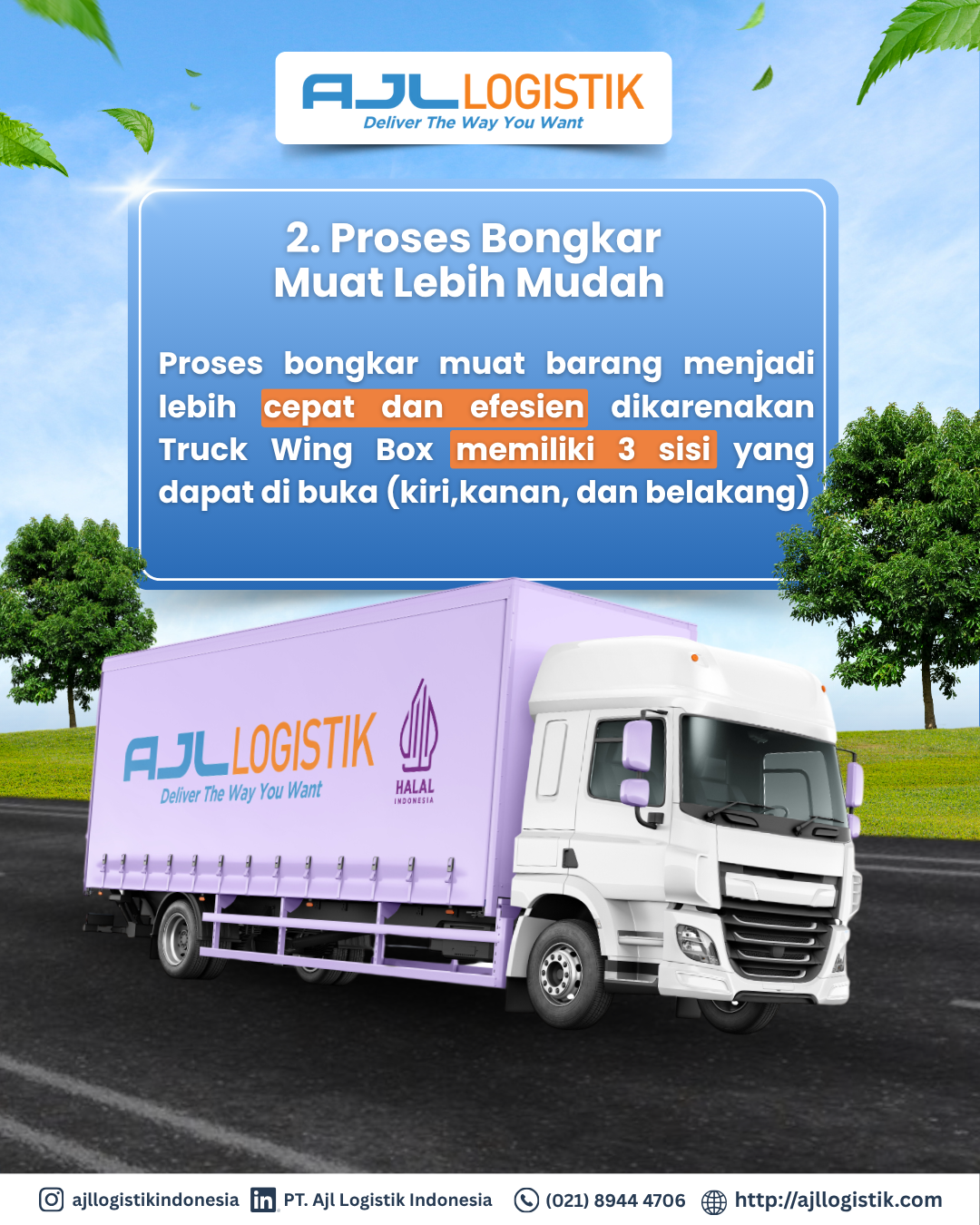 - Proses bongkar muat barang menjadi lebih cepat dan efesien dikarenakan Truck Wing Box memiliki 3 sisi yang dapat di buka (kiri,kanan, dan belakang)