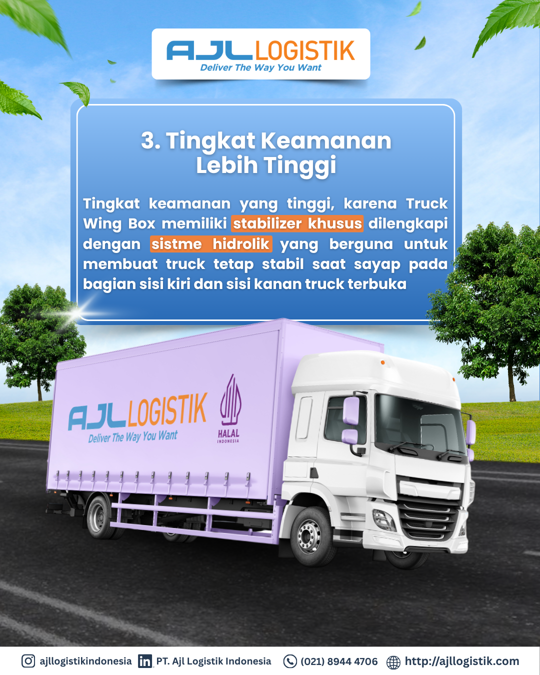 Tingkat Keamanan Lebih Tinggi - Tingkat keamanan yang tinggi, karena Truck Wing Box memiliki stabilizer khusus dilengkapi dengan sistme hidrolik yang berguna untuk membuat truck tetap stabil saat sayap pada bagian sisi kiri dan sisi kanan truck terbuka