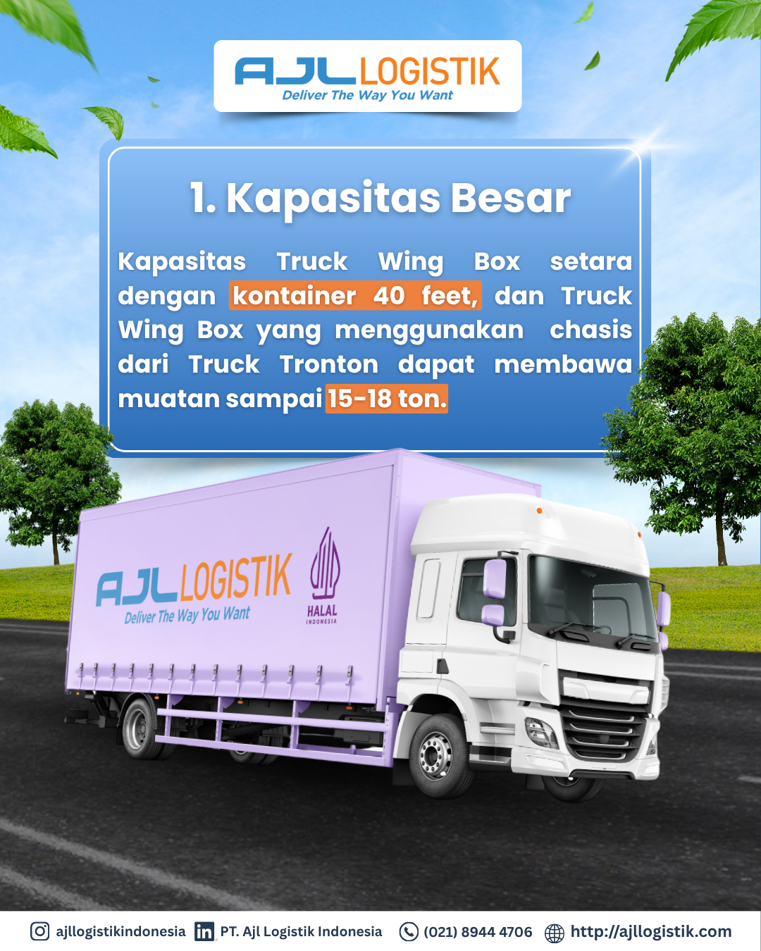 - Kapasitas Truck Wing Box setara dengan kontainer 40 feet, dan Truck Wing Box yang menggunakan chasis dari Truck Tronton dapat membawa muatan sampai 15-18 ton.